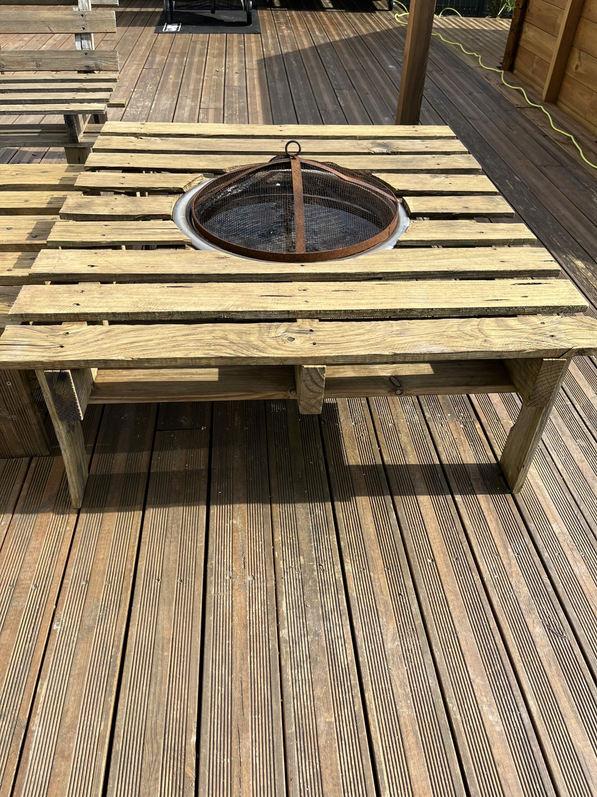 Le Braséro sur table basse en palette est doté d’un plateau en bois qui offre un espace pratique pour poser des boissons, des collations pour un rassemblement en plein air.