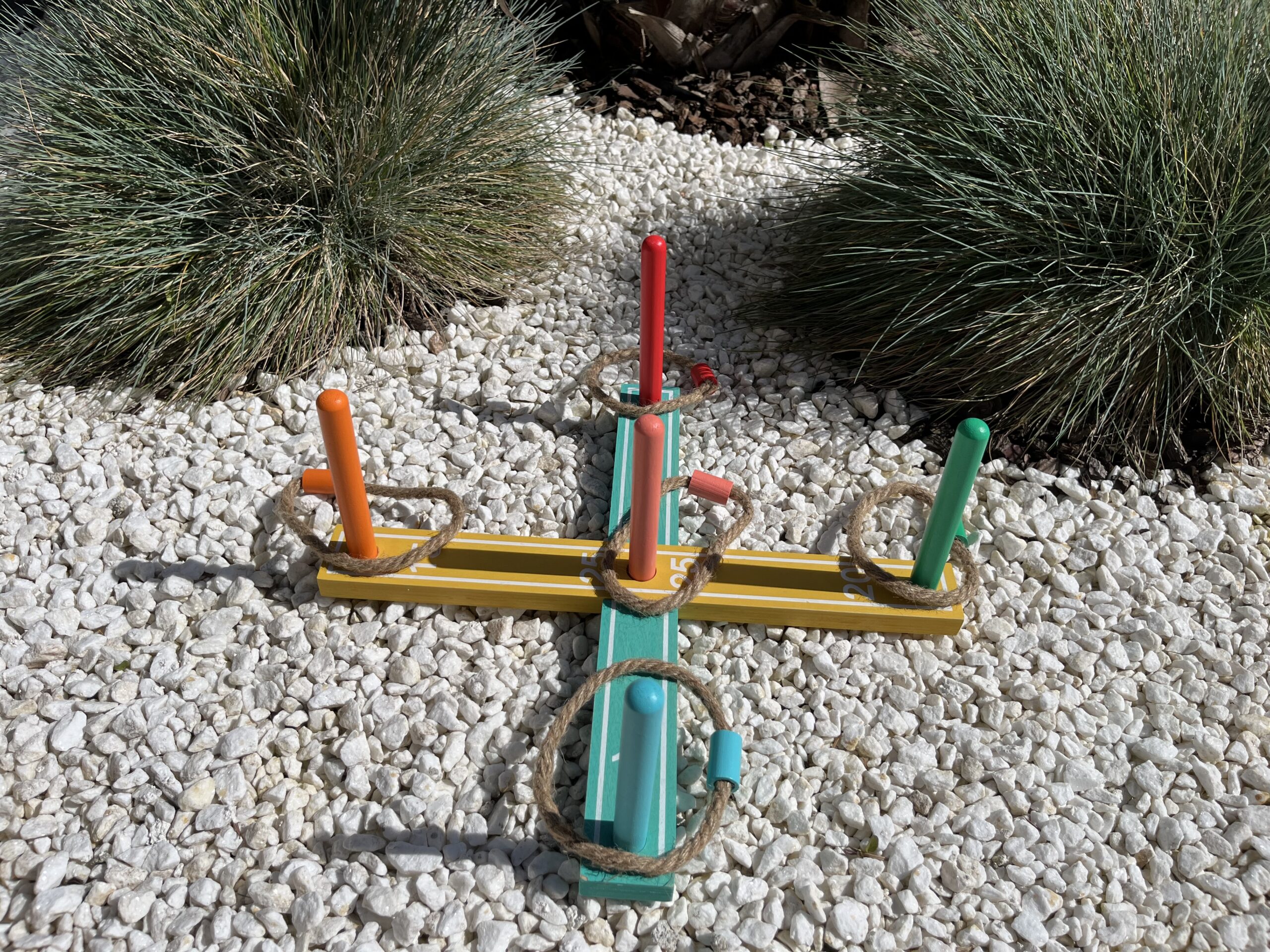 À tour de rôle, les joueurs doivent lancer l’anneau autour d’une quille et gagner les points indiqués sur le bâton dans lequelle a été jeté l’anneau.