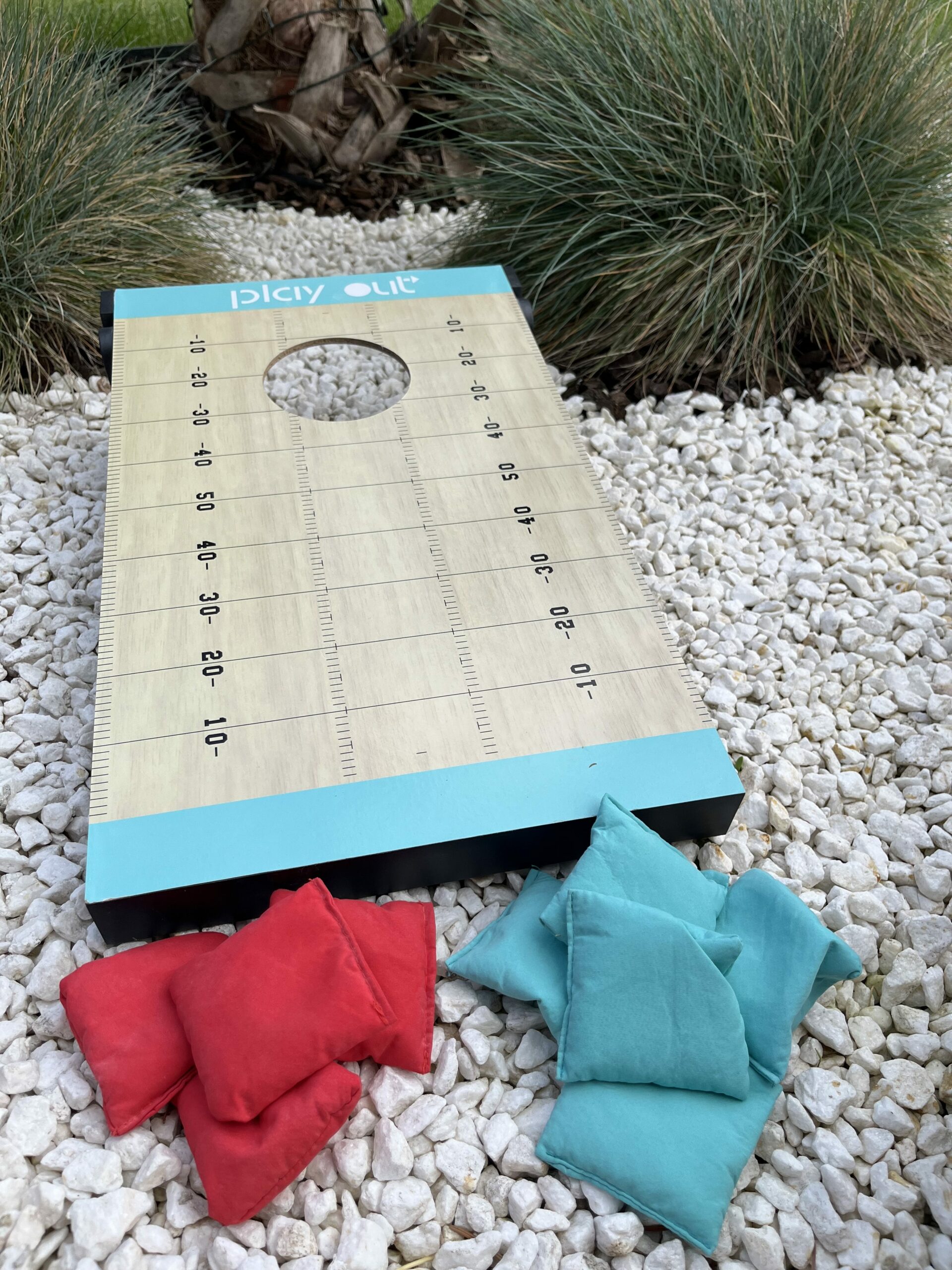 Jeu en bois 2 en 1 de lancer et de morpion contenant 5 sacs bleus et 4 sacs rouges.